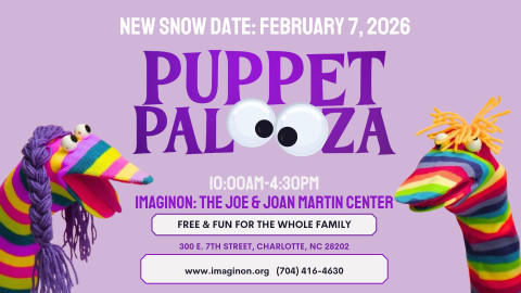 PuppetPalooza is BACK at ImaginOn: The Joe & Joan Martin Center, coming to you on (NEW SNOW DATE!) Saturday, February 7th from 10:00-4:30 with FREE, family-friendly puppet-based entertainment all day. We have invited some of the best puppetry troupes from the East Coast to perform, with shows starting every fifteen minutes, all day long, as well as puppet parades, karaoke, workshops, games, and crafts.